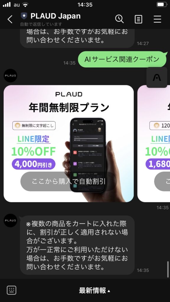 ※LINEクーポンはPLAUD公式サイトサイトから「LINE友達追加」するともらえます。
